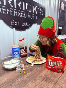 Each day leading up to Christmas, Darrick’s Preferred Auto will announce a new giveaway on Facebook — sometimes it’s a gift card to a local favorite, sometimes it’s cash, and sometimes it’s something totally unexpected. You never know what Arial the Elf might pull out of her bag. Some days she’s hanging from the shop lights, other days she’s sneaking around the garage with a prize in hand.